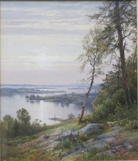 Our road trip begins in the Northeastern United States, with William Trost Richards’ Lake Winnipesaukee at Weirs Landing, New Hampshire, created in 1876. A one hundred mile train ride from Boston, the New Hampshire town of Weirs, situated along Lake Winnipesaukee, became a popular destination for late 19th century city dwellers seeking respite during the summer months. An adherent of the American Pre-Raphaelite Movement as well as a worldly and spiritual man, Richards believed that each rock, leaf, and petal was a mark of divine creation and should be rendered accurately. His watercolor, Lake Winnipesaukee at Weirs Landing, New Hampshire, displays his characteristic clarity and offers a splendid view of the lake’s rocky outcroppings and lush vegetation.