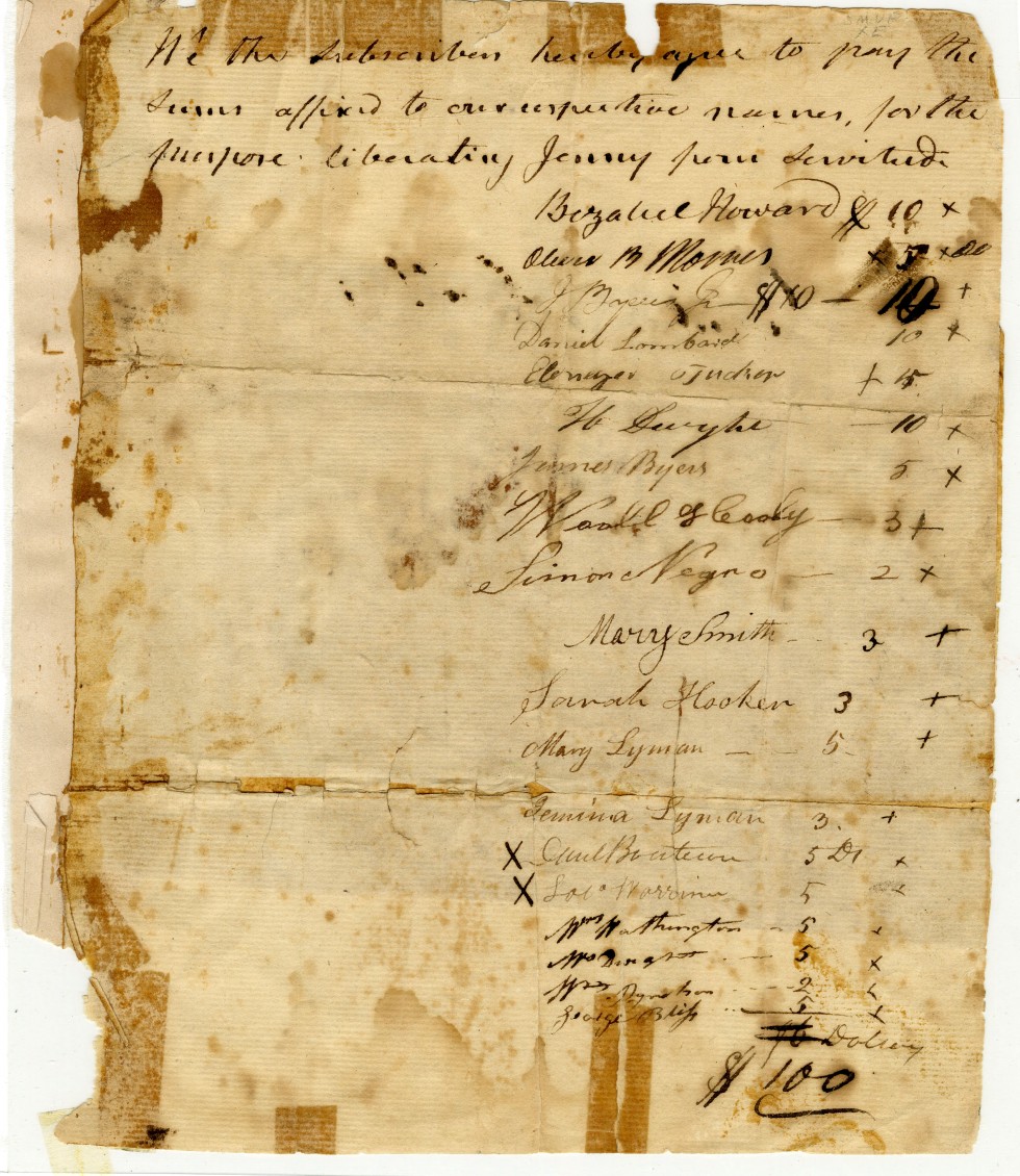 Bill of Sale for Jenny, 16 February 1808, with signatures of contributors. (The original document is restricted, however photocopies of the original are available for inspection). In the early 1800s a young African-American woman named Jenny Cumfrey, often referred to simply as “Jenny,” moved to Springfield, Massachusetts. Jenny was a self-liberated enslaved person formerly living in New York State, where slavery was still legal. Shortly after her arrival Jenny fell in love with another Springfield resident, Jack Williams. They were married in Springfield’s First Church on Court Square by Reverend Bezaleel Howard in 1802. Jack Williams and Jenny were well-known throughout the town and they set up a modest home on what was then the outskirts of the town on the banks of Goose Pond, near present-day Mason Square. In 1808, Peter Van Geyseling, a resident of Schenectady, New York, arrived in Springfield and claimed Jenny as his property and he brandished the necessary paperwork to prove his claim. Once the news of Jenny’s plight spread through the town, Reverend Howard quickly developed a plan of action. Howard figured the only way to save Jenny was to buy her freedom, so he negotiated a sale price of $100 (a sizable sum at that time) with Van Geyseling. Soon, many of the town’s most prominent citizens came forward with donations to raise the necessary money. The bill of sale was signed by 19 residents, including a man listed simply as “Simon, negro.” The significance of Jenny’s story lies in its early date. It shows the existence of an anti-slavery sentiment in western Massachusetts decades before abolitionist organizations like the Hampden County Colonization Society (1825) and the Hampden County Anti-Slavery Society (1833) were formed. In fact, it may be the earliest example of a community of people purchasing the freedom of an enslaved person in the U.S.