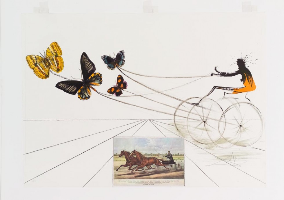 Interpretation by Salvador Dali of the Currier & Ives print The Celebrated Trotting Team EDWARD and SWIVELLER… A color miniature of the print is adhered to the bottom center of the Dali print. 112/250