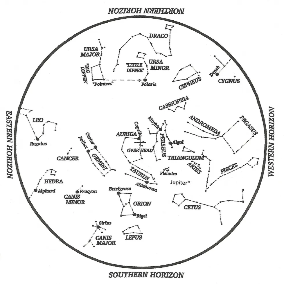 The Winter Hexagon has moved into center stage and acts as a helpful guidepost to the night sky. This asterism consists of the 1st magnitude stars Sirius, Rigel, Aldebaran, Capella, Pollux, and Procyon with another bright star, Betelgeuse, lying in its central region. Another useful guidepost is the three belt stars of Orion the hunter. These stars are positioned in a line that points northwest to the face of Taurus the bull. In the other direction, they point to Sirius, the brightest star of the nighttime sky.