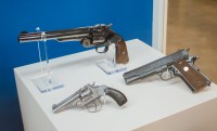 This exhibit also includes three guns owned or used by movie stars, including .32 caliber Smith & Wesson belonging to George Montgomery, well known for his career as a film actor in many westerns. Clint Walker, best known as the star of the Cheyenne TV series, owned a Smith & Wesson Model 3 that is on view. Also on display is a prop gun designed to look like a .45 caliber U.S. Army automatic pistol used by Lee Marvin in the film, Delta Force in 1986.