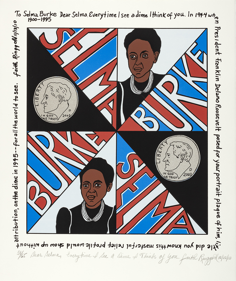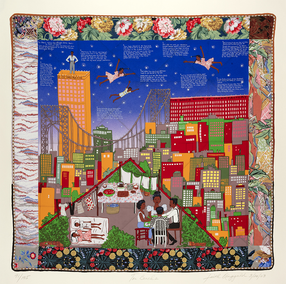 Featured prominently are five works by artist, activist, and author Faith Ringgold (American, born 1930). Best known for imaginative textile artworks called story quilts, Ringgold draws on her lived experience and on collective histories to create captivating narrative images. Since the 1990s, Ringgold has used silkscreen prints, such as those on view in this exhibition to share her work more widely. In her prints, Ringgold revisits her childhood in Harlem and amplifies the stories of people she admires.