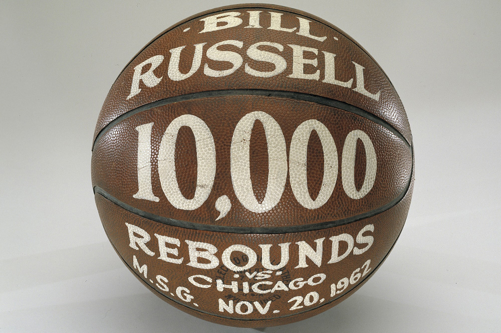 Bill Russell’s Basketball: In his day, Bill Russell (born 1934) was considered the best defensive center in the history of the game, initiating strategies that remain key to championship basketball. A star college player, 1956 Olympic gold medalist, and famed player for the Boston Celtics, he became the first African American head coach in the NBA, coaching first the Celtics and later the Seattle Supersonics. This Wilson game ball marked Russell’s 10,000th rebound; he ultimately achieved 21,620.