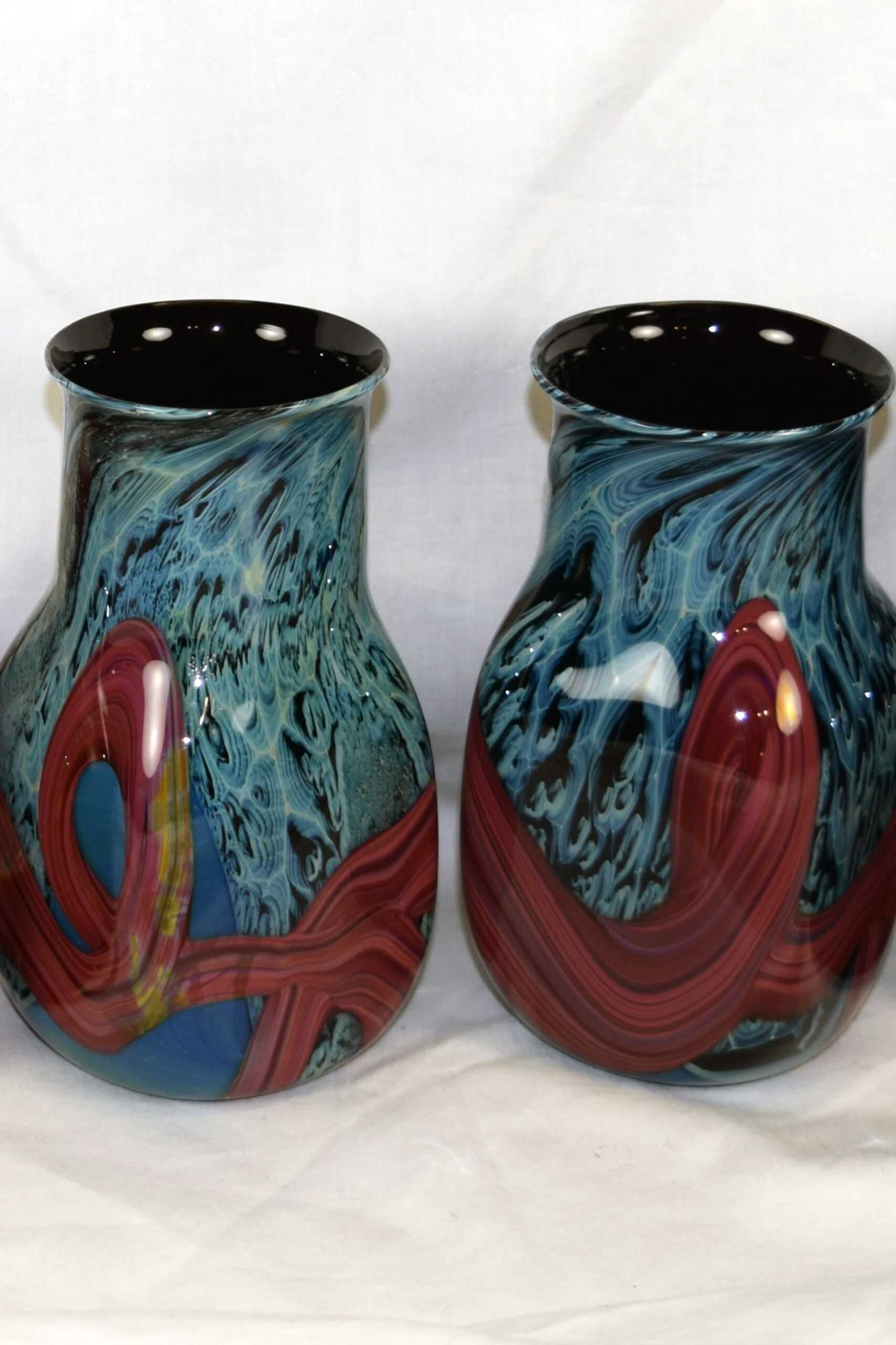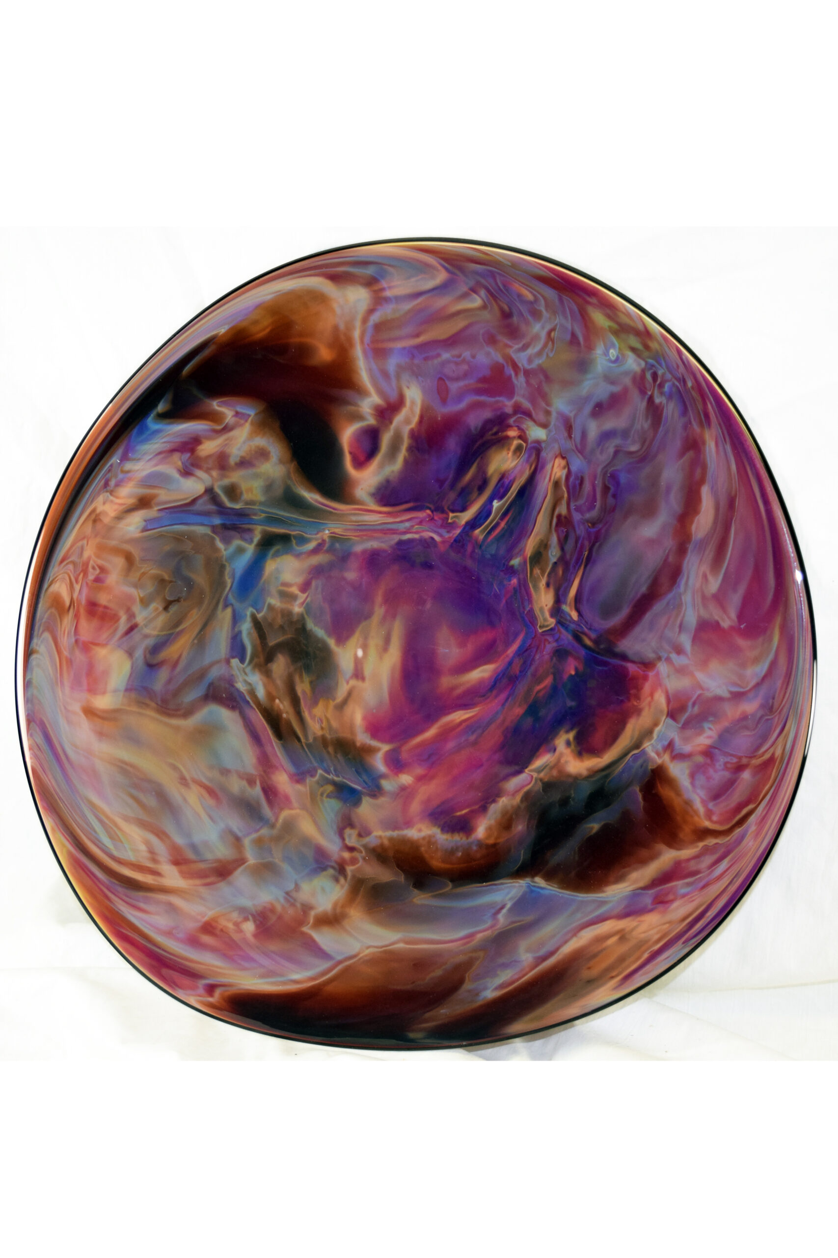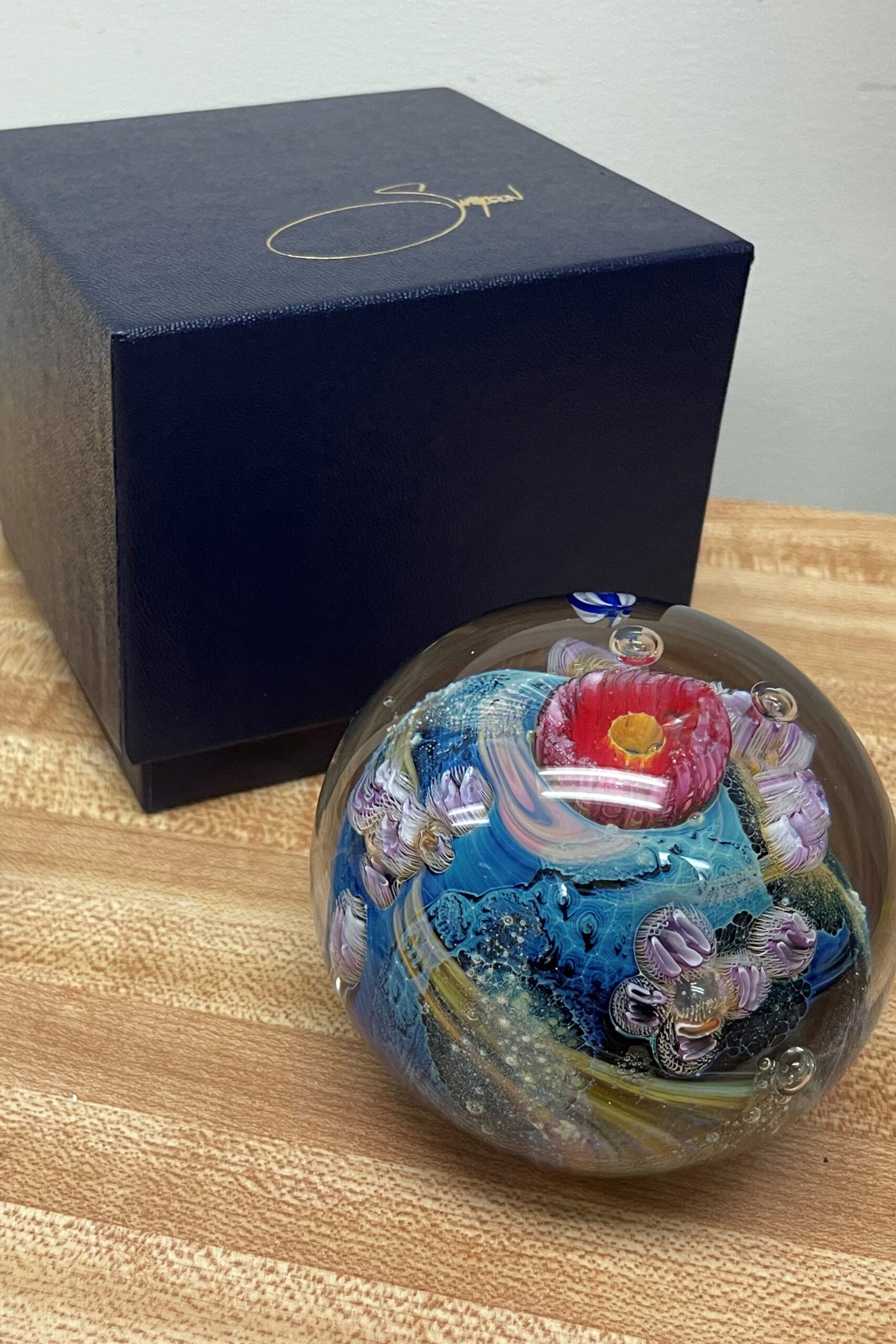 Own a slice of the night sky when you take home this dazzling Singularity Platter. Created in 2017, the breathtaking platter is exemplary in Simpson’s recent body of work and uses thin strands of white glass to explore astrophysical concepts such as the relationship of space and time. Enveloped in Simpson’s signature starry Blue New Mexico glass and offset by a brilliant red rim, the mesmerizing central design has a gravitational pull of its own! This one-of-a-kind work is sure to be the centerpiece of any room, eliciting wonder and sparking conversation.
